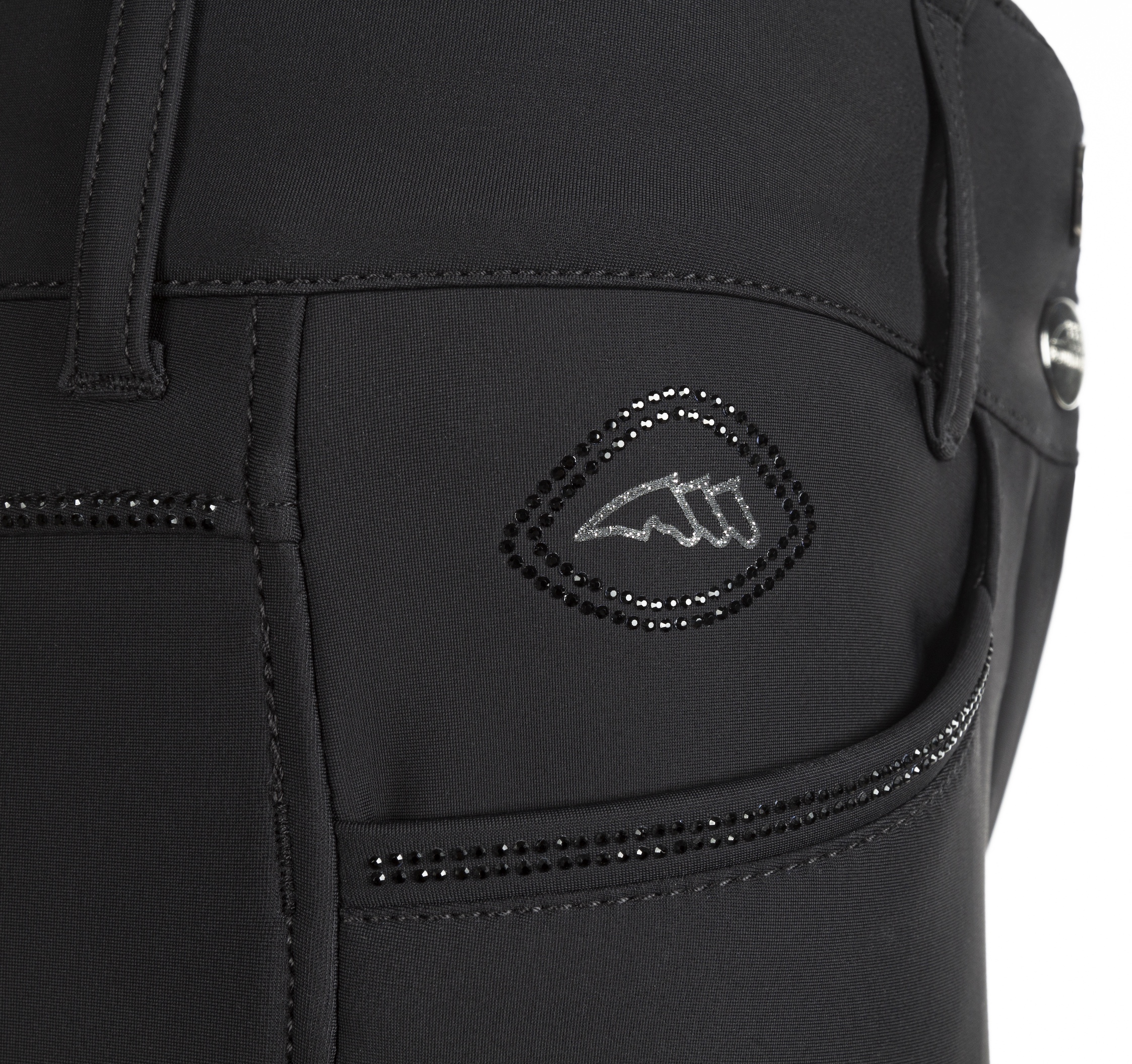 - Strassstein-Ornamente am Gesäß und den Vordertaschen