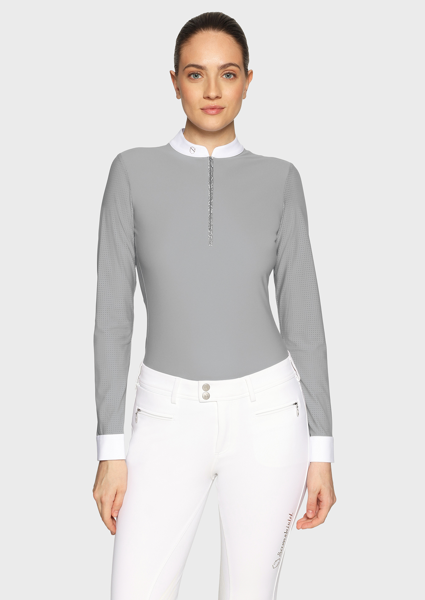 Elegantes Damen Turniershirt im Slim Fit mit langen Ärmeln für eine feminine, sportliche Passform. Das atmungsaktive, elastische und schnelltrocknende italienische Funktionsmaterial sorgt für höchsten Tragekomfort im Sattel. Ein unsichtbarer Half-Zip mit Swarovski® Crystal Fabric, das Samshield Wappen mit Swarovski® am Kragen sowie perforierte Einsätze an Rücken und Ärmeln verleihen dem Shirt einen edlen Premium-Look.