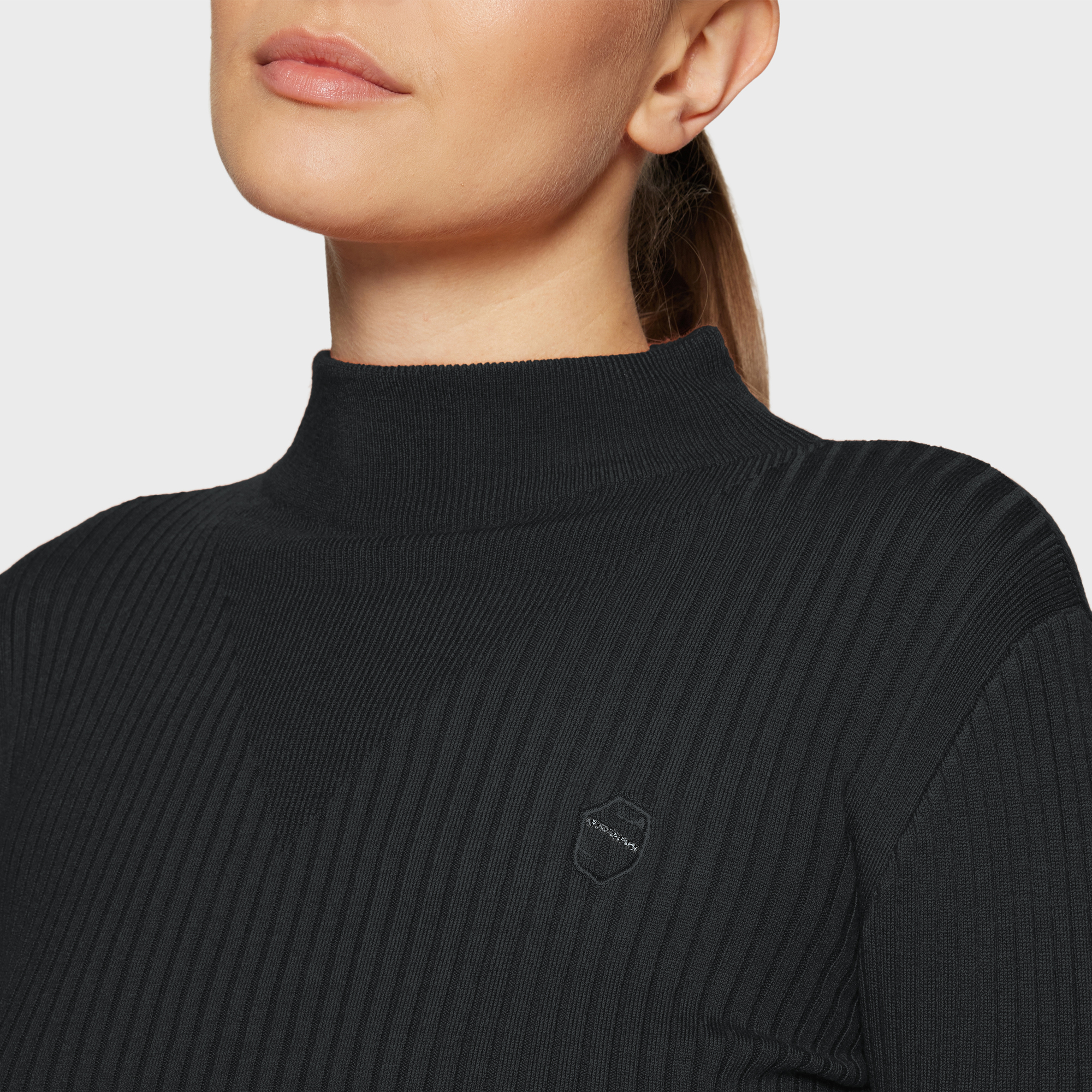 Der Lidia Classic Damenpullover verbindet zeitlose Eleganz mit edlen Details und höchstem Tragekomfort. Das schlichte Design mit hohem Kragen und langen Ärmeln wird durch ein besticktes Samshield-Wappen mit funkelnden Kristallverzierungen auf der Vorderseite sowie Swarovski®-Knöpfe an den Ärmeln stilvoll akzentuiert. Die feine Rippenstruktur unterstreicht den hochwertigen Look und macht den Pullover zu einem echten Hingucker – sowohl im Alltag als auch im Reitsport.