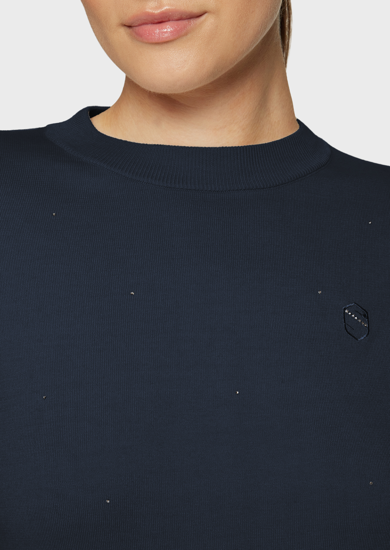 Der Phoebe Feinstrickpullover für Damen kombiniert zeitlose Eleganz mit sportlicher Funktionalität. Das schlichte Design wird durch ein edles Swarovski® Wappen am Arm sowie eine dezente All-over-Kristallverzierung stilvoll aufgewertet. Die Rippbündchen an Ärmeln und Saum sorgen für eine perfekte Passform und hohen Tragekomfort.