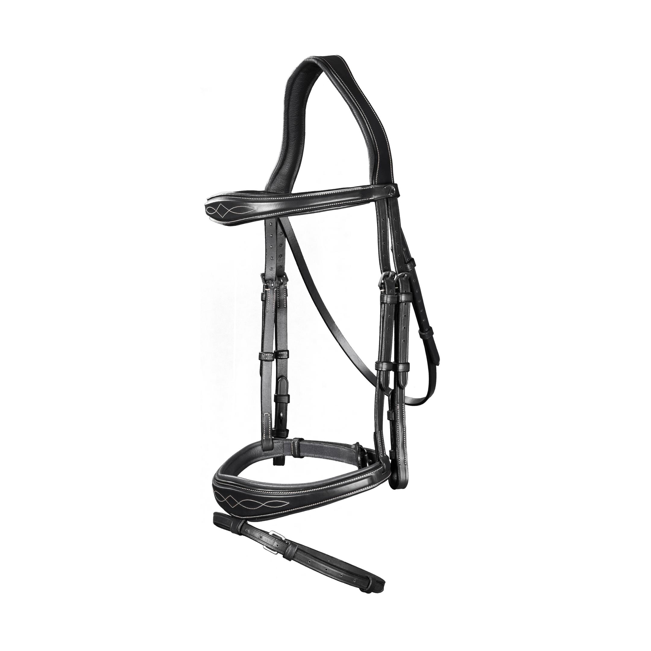 Die anatomische Dyon Trense besticht durch ihre eleganten Ziernähte in Beige und verfügt über einen Stirnriemen sowie einen Nasenriemen mit einem breiten Mittelstück. Ein abnehmbarer Sperrriemen von 1/2 Zoll (13 mm) und silberne Schnallen runden das hochwertige Design ab.