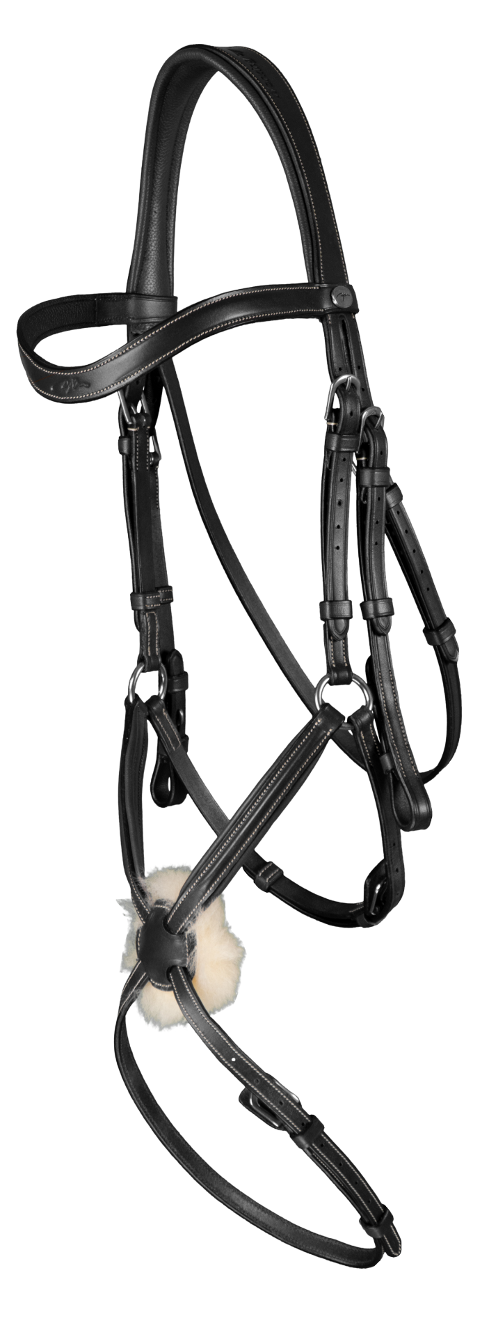 Das anatomisch geformte Genickstück, kuscheliges Lammfell am Nasenriemen und der gepolsterte Stirnriemen mit feinen Kontrastnähten sind für das Pferd bei der täglichen Arbeit angenehm und die Trense macht Eindruck.