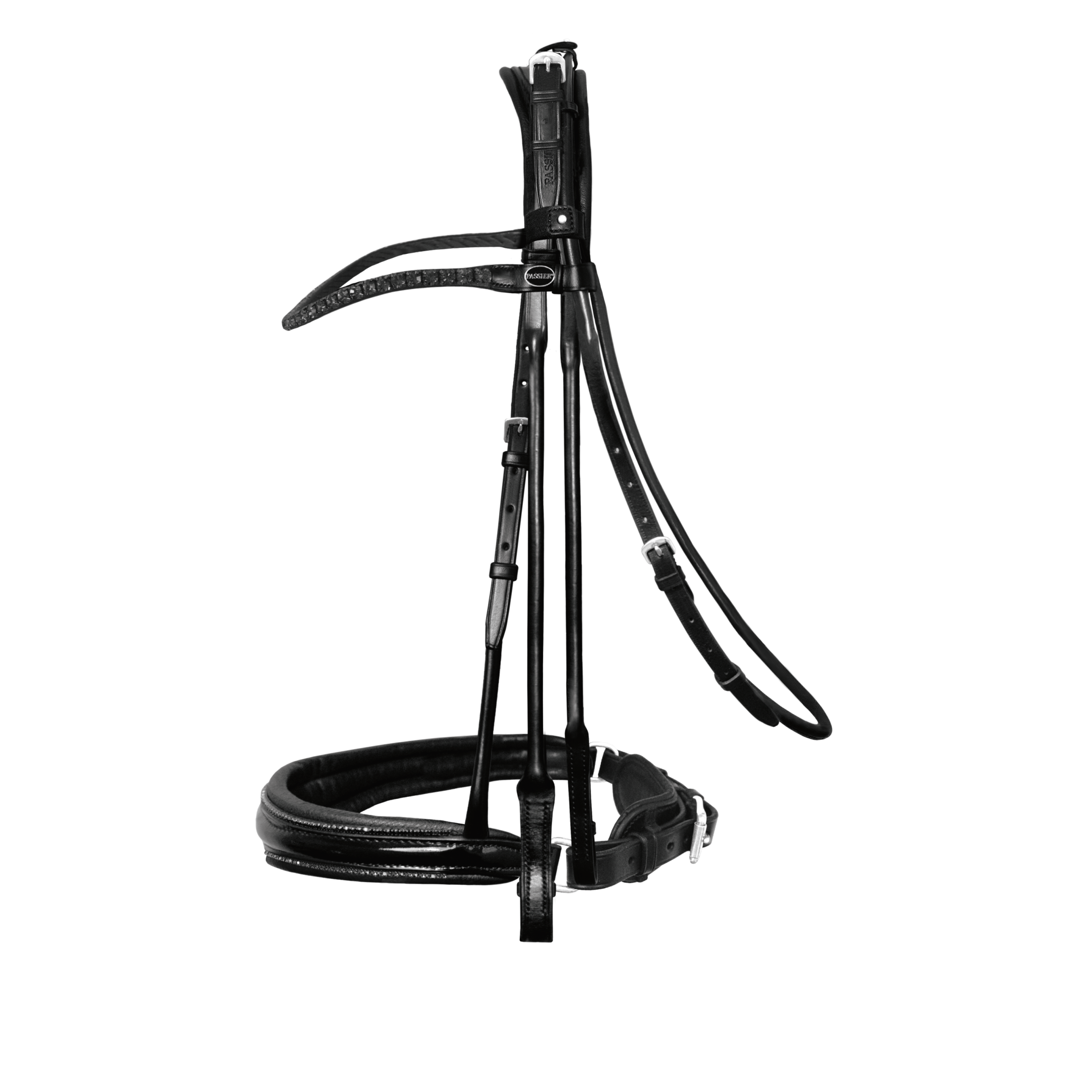 Die neue rund genähte, elegante Kandare Highscore hat ein anatomisch geformtes, weich unterfüttertes Kopfstück und ist so besonders pferdefreundlich. Das Reithalfter Spezial aus schwarzem Lackleder mit glänzendem Zierkeder mit kleinen Premium Crystals in Graphite ist ebenfalls anatomisch geformt und weich unterlegt. Der geschwungene Stirnriemen mit extra großen, funkelnden Premium Crystals in Graphite komplettiert den eleganten, glänzenden Look.