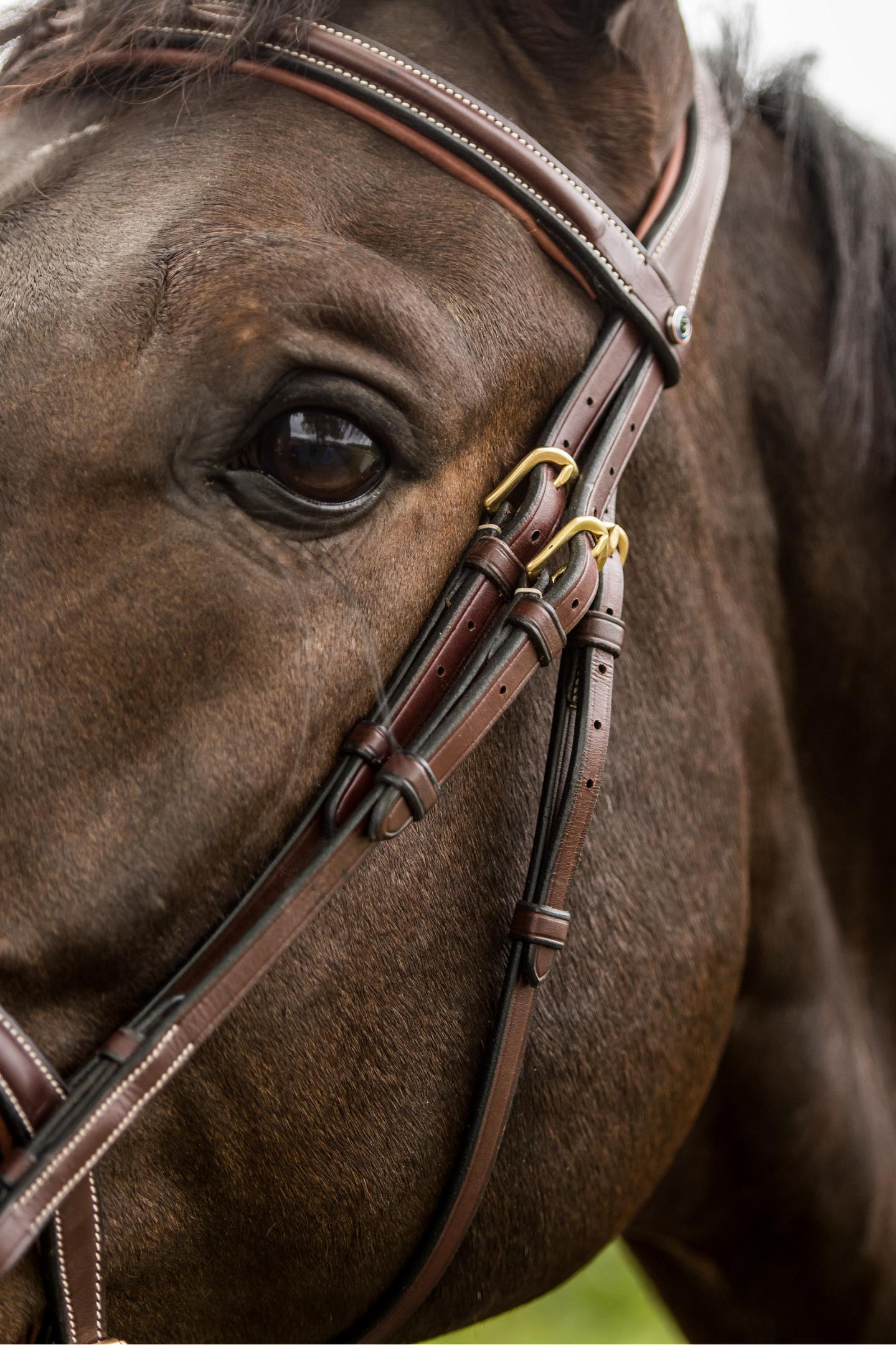 Das TRUST Zaumzeug Calgary kombiniert Funktionalität, anatomische Passform und elegantes Design. Der kombinierte Nasenriemen mit Schnallenschutz ist 3 mm weich gepolstert, ebenso wie der gerade Stirnriemen. Eine dezente Zierstickerei verleiht dem Zaumzeug eine edle Optik.
