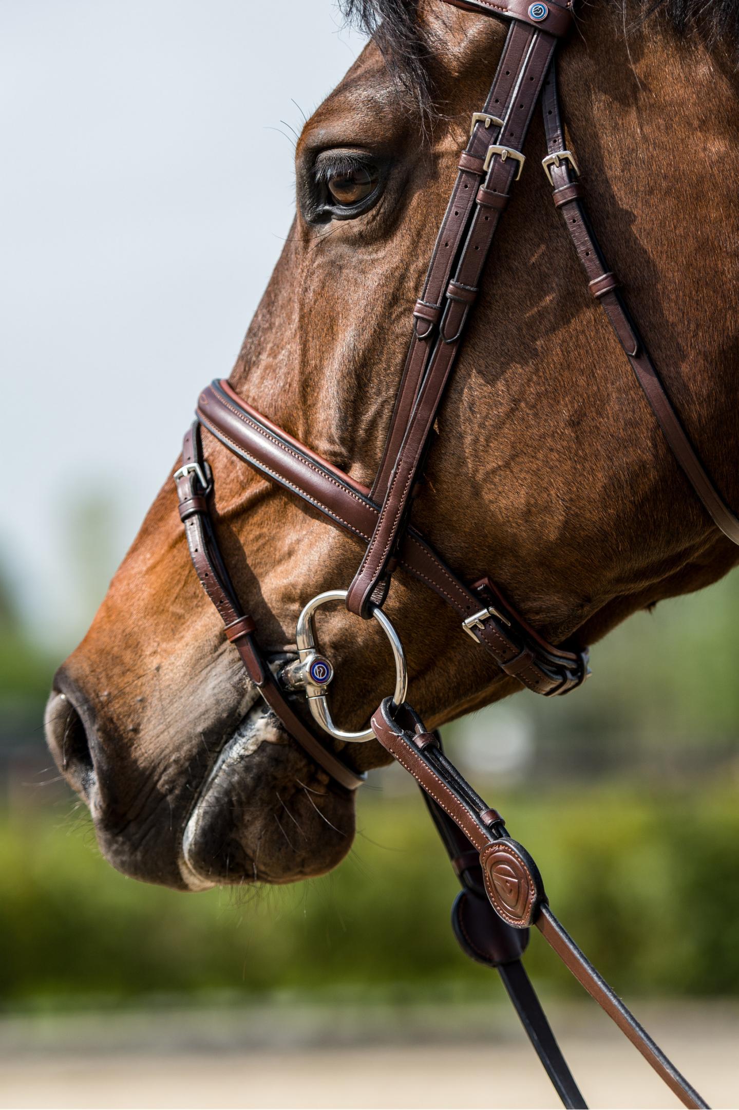 Das TRUST Zaumzeug Calgary kombiniert Funktionalität, anatomische Passform und elegantes Design. Der kombinierte Nasenriemen mit Schnallenschutz ist 3 mm weich gepolstert, ebenso wie der gerade Stirnriemen. Eine dezente Zierstickerei verleiht dem Zaumzeug eine edle Optik.