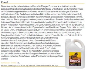 Diese eisenreiche, schnellwirksame Formel in flüssiger Form wurde entwickelt, um die Leistungsfähigkeit eines hart arbeitenden Sportpferdes zu unterstützen. Ein Turnierpferd muss, um Höchstleistungen erzielen zu können, seinem Körper sehr viel abverlangen. Damit ist natürlich ein erhöhter Bedarf an spezifischen Nährstoffen verbunden. Mittlerweile ist weitläufig bekannt, dass es durch das Schwitzen zu einem Verlust an essentiellen Körpersalzen kommt. Aber nicht nur Elektrolyte gehen verloren, sondern auch Eisen! Eisen ist für die Gesundheit und Leistungsfähigkeit eines Sportpferdes unerlässlich. Niedrige Eisenwerte äußern sich rasch, zu Beginn meist durch Abgeschlagenheit und Leistungseinbußen. Dies kann bis hin zur Blutarmut führen. Hier kommen die wertvollen Eigenschaften von EnerG zum Tragen. Es ist nicht nur reich an Eisen, EnerG enthält auch Kupfer und Zink in einem idealen Verhältnis. Beide unterstützen die Umsetzung von Eisen und spielen dadurch eine zentrale Rolle bei der Optimierung des Energiestoffwechsels. EnerG enthält ein höheres Level an Eisen, Kupfer und Zink als ähnliche Konkurrenzprodukte, und wird ergänzt durch ein unübertroffenes Level an Vitamin B Komplexen, die zu Gesundheit und Effizienz der roten Blutkörperchen und des Energiestoffwechsels beitragen. EnerG enthält außerdem Vitamin C, ein starkes Antioxidant, welches bei seiner Arbeit durch Vitamin K unterstützt wird. EnerG ist ein sorgsam entwickeltes Produkt, mit Nährstoffen, die nichts anderes tun, als die Blutwerte sowie den Energiestoffwechsel zu unterstützen, und kann daher bei Bedarf einem jeden Pferd bedenkenlos zugefüttert werden.