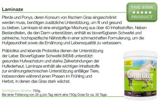 Pferde und Ponys, deren Konsum von frischem Gras eingeschränkt werden muss, benötigen zusätzliche Unterstützung, um fit und gesund zu bleiben. Laminaze ist eine einzigartige Mischung aus über 40 Inhaltsstoffen. Neben Bestandteilen, die den Darm unterstützen, enthält es bioverfügbaren Schwefel und zahlreiche, hochspezifische Nährstoffe in einer schmackhaften Rezeptur, um die Hufgesundheit sowie die Ernährung und Lebensqualität zu verbessern. Präbiotika und lebende Probiotika dienen der Unterstützung der Leber. Bioverfügbarer Schwefel (MSM) unterstützt gesundes Hufwachstum und starke Zellverbindungen der Huflederhaut. Laminaze enthält alle wichtigen Inhaltsstoffe zur ernährungstechnischen Unterstützung anfälliger Tiere, insbesondere während jenen Phasen im Frühling und Herbst, in denen das Gras stark wächst.
