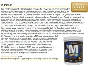 Für beste Muskulatur, Kraft und Ausdauer. M Power ist ein herausragendes Produkt zur Unterstützung eines natürlichen, gesunden Muskelaufbaus. M Power wird von zahlreichen, europäischen Turnierreitern erfolgreich angewendet. Diese einzigartige Formel ist reich an Aminosäuren – die als Bausteine von Proteinen eine zentrale Funktion für ein gesundes Muskelgewebe bilden – und kombiniert diese mit natürlichen Antioxidantien und ausgewählten Kräutern, um eine einwandfreie, gesunde Muskelfunktion zu unterstützen. Diese erstklassigen Inhaltsstoffe werden ergänzt durch Vitamine und Spurenelemente, welche für eine hohe Leistungsfähigkeit der Muskeln essentiell sind. Darüber hinaus enthält M Power spezifische Nährstoffe, einschließlich Lebendhefen, zur Optimierung des Verdauungsprozesses, sodass die muskelfördernden Inhaltsstoffe effizient im Organismus umgesetzt werden. M Power wurde entwickelt, um den natürlichen Muskelaufbau junger, wachsender Pferde zu unterstützen, ebenso wie bei Pferden, die nach einer Trainingspause antrainiert werden oder Anzeichen von Muskelschwund aufweisen. M Power kann außerdem zur täglichen Unterstützung von Muskulatur, Ausdauer und Kraft eines jeden Turnierpferdes eingesetzt werden.