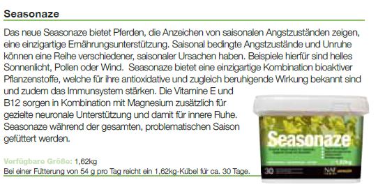 Das neue Seasonaze bietet Pferden, die Anzeichen von saisonalen Angstzuständen zeigen, eine einzigartige Ernährungsunterstützung. Pferde können von einer Reihe verschiedener saisonaler Auslöser betroffen sein. Häufig führen helles Sonnenlicht, Pollen oder ein windiger Tag zu saisonal bedingten Angstzuständen und Kopfbeschwerden. Durch die gezielte Verbesserung der Ernährung werden die natürlichen Abwehrkräfte des Pferdes optimiert. Seasonaze bietet eine einzigartige Kombination von Phytochemikalien aus natürlichen Quellen, die als natürliche Antioxidantien, beruhigende Unterstützung und für die Immunfunktion wirken. Weiterhin sorgt MSM für Weichgewebekomfort und Vitamin E und Vitamin B12 für gezielte neurale Unterstützung, mit Magnesium, das zu jeder Jahreszeit für innere Ruhe sorgt.