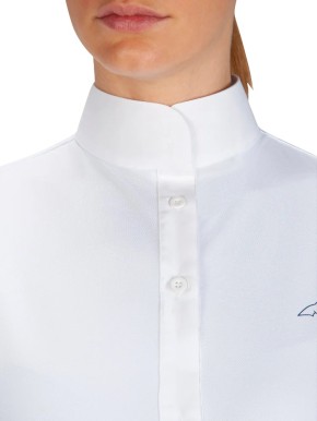 Die langärmelige Damen-Turnierbluse ist aus hochwertigem, technischem Piqué Stretchgewebe (X-Premium) gefertigt. Sie bietet eine atmungsaktive und bequeme Passform, ideal für sportliche Aktivitäten. Der Kragen und die Manschetten sind aus weißem Popeline gefertigt, was der Bluse einen eleganten Akzent verleiht. Ein blau gedrucktes Logo ziert den Brusteinsatz und rundet das Design ab. Die Bluse hat eine Slim-Fit-Silhouette, die die feminine Form betont.